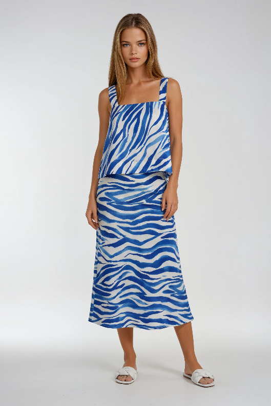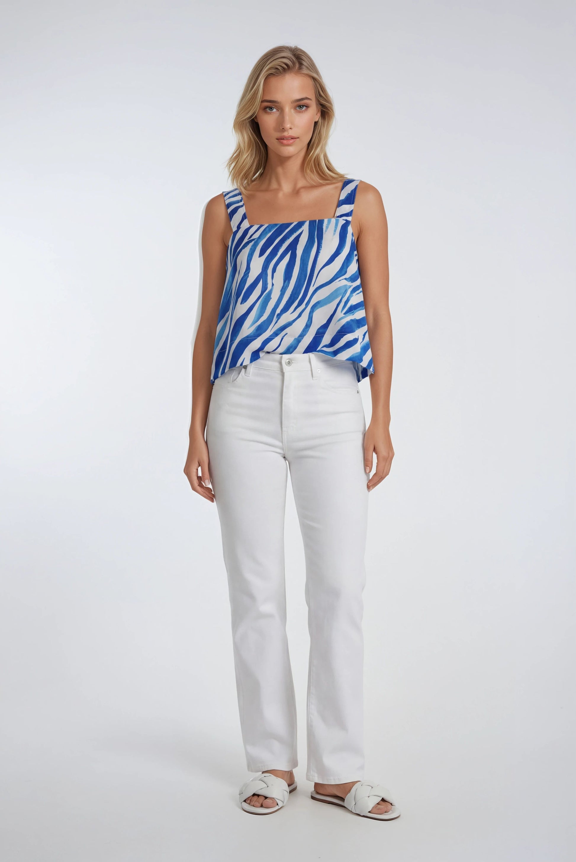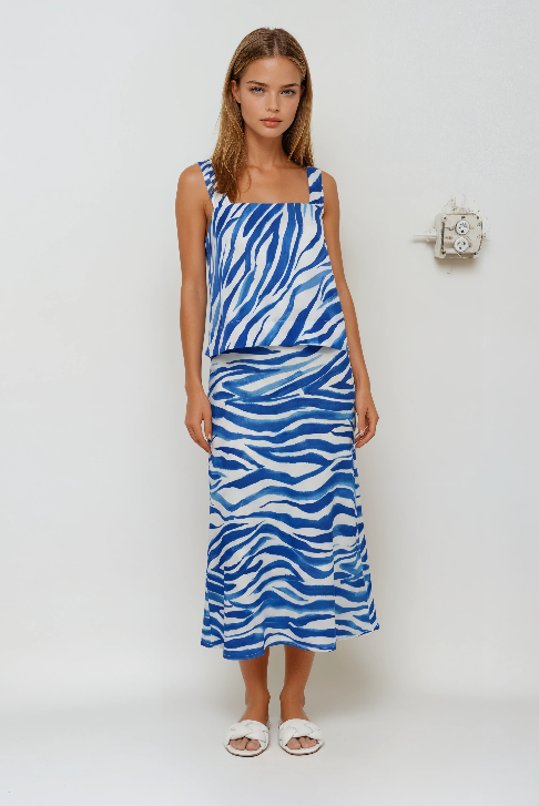 Unleash your wild side with the Pixie Tank that's about to become your new obsession! This isn't just another top – it's your ticket to turning heads and making statements wherever you roam. Our electric blue zebra print screams confidence while whispering "effortlessly cool."